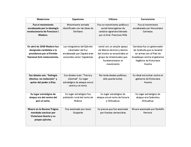 Cuadro Comparativo Maderismo Villismo Zapatismo Y Carrancismo Pdf